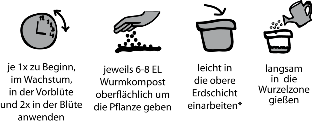 Vielseitige Anwendungsmöglichkeiten: als Teil deiner Bodenmischung oder deines Anzuchtsubstrats, als Dünger in Wachstum und Blüte, zum Recycling deiner Erde oder im Komposttee